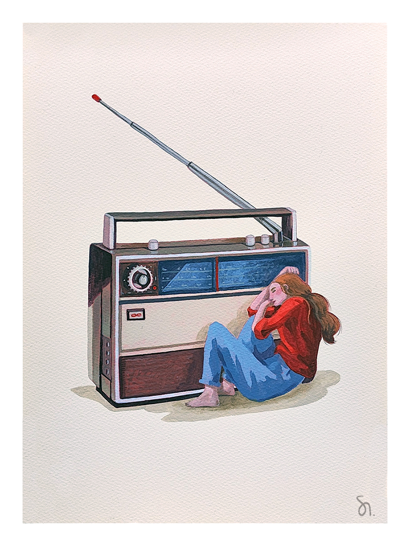 A dreamy girl listening to the radio.