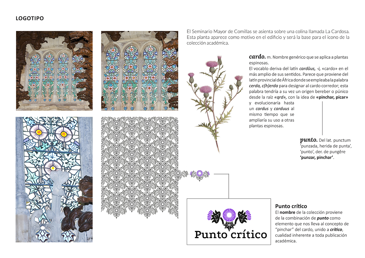 Para dar un marco a la colección académica, las cubiertas tendrán en común el uso de elementos decorativos. Estos podrán ser tomados de los numerosos ejemplos que encontramos en el edificio de la Fundación Comillas, así como otros derivados de la temática, contenido o título de cada obra que se edite.