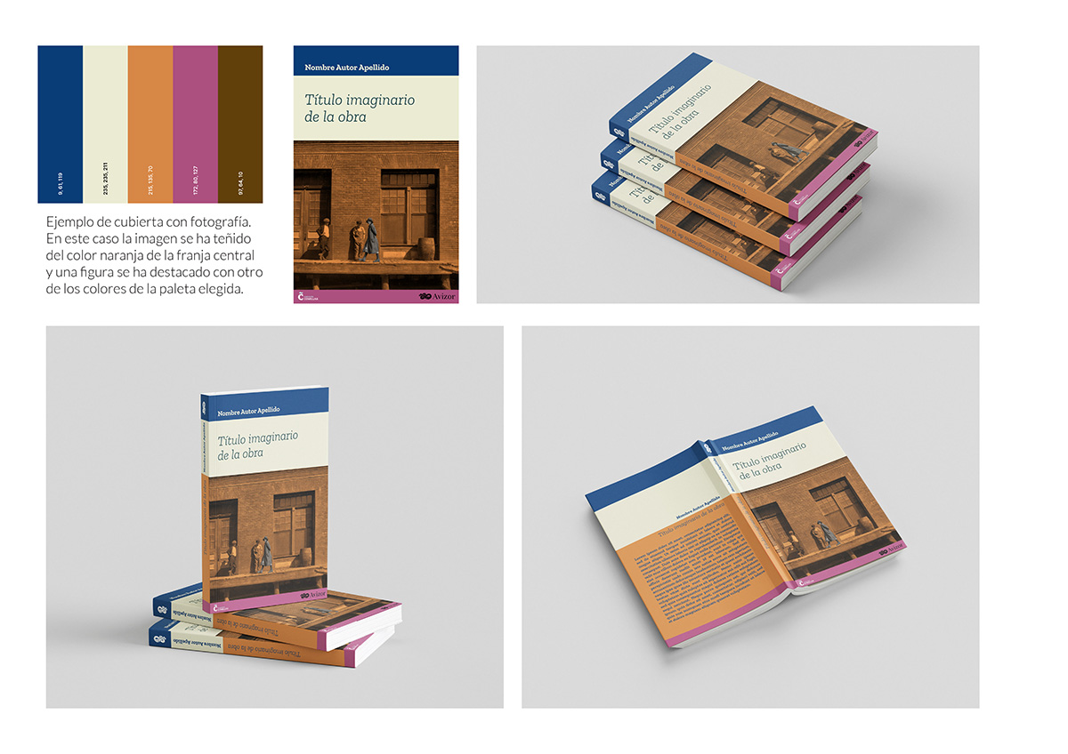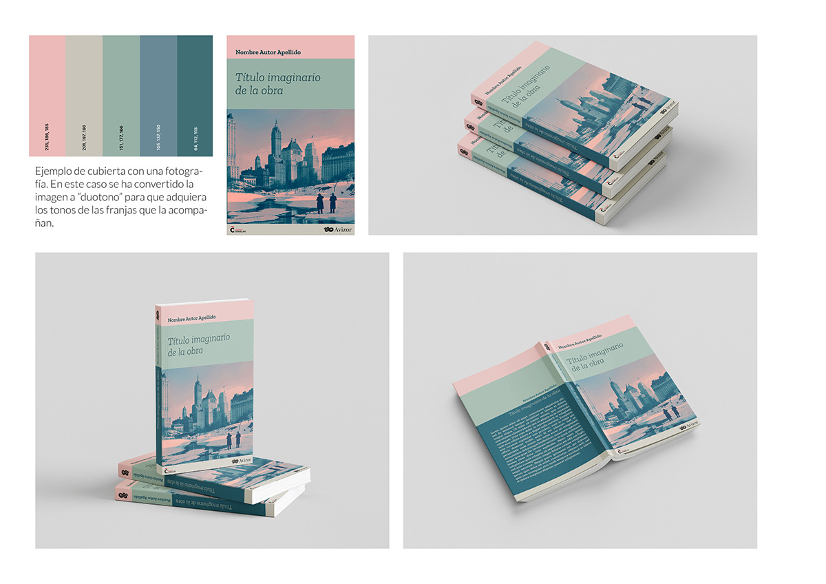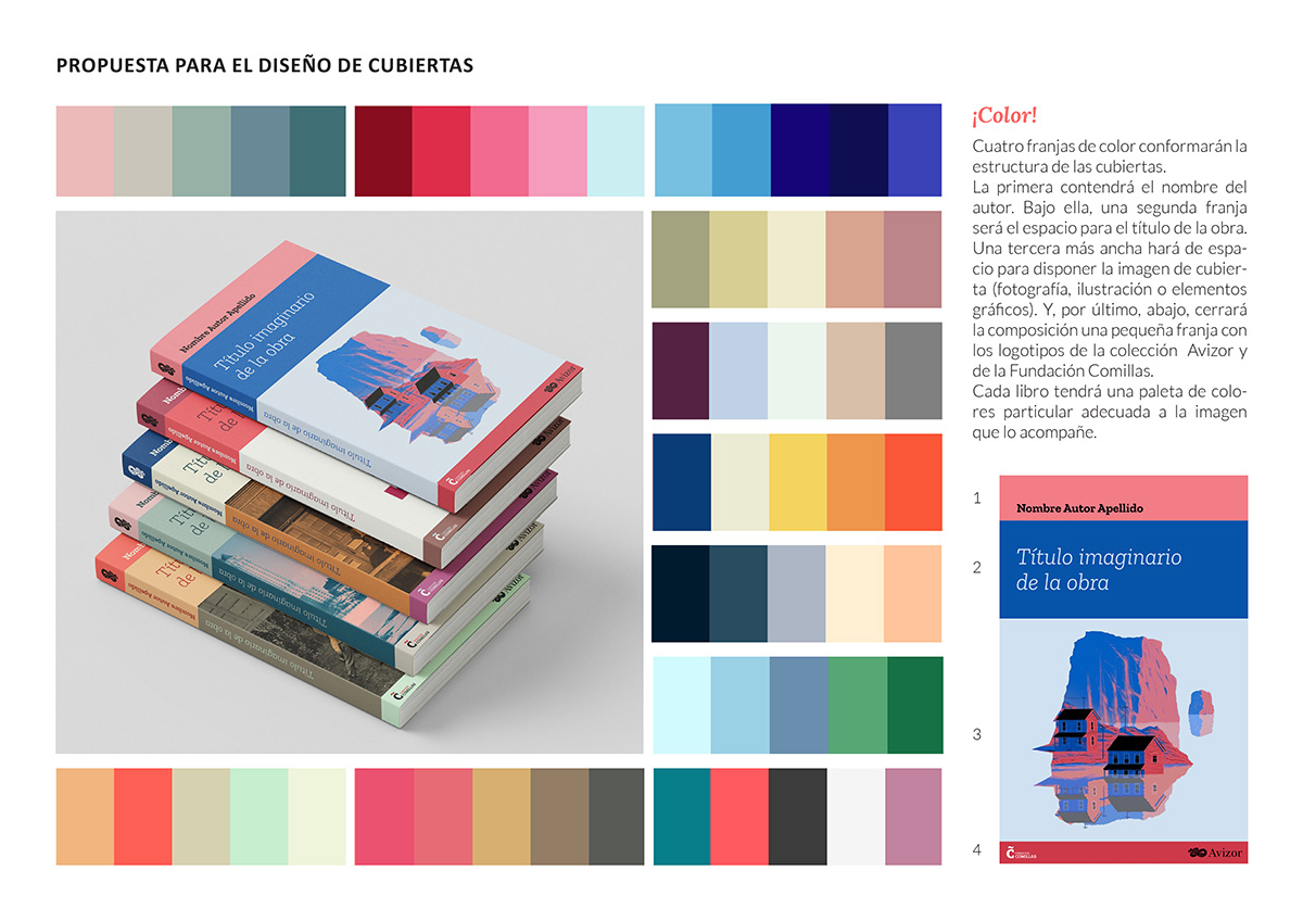 La primera contendrá el nombre del autor. Bajo ella, una segunda franja será el espacio para el título de la obra. Una tercera más ancha hará de espacio para disponer la imagen de cubierta (fotografía, ilustración o elementos gráficos). Y, por último, abajo, cerrará la composición una pequeña franja con los logotipos de la colección Avizor y de la Fundación Comillas.