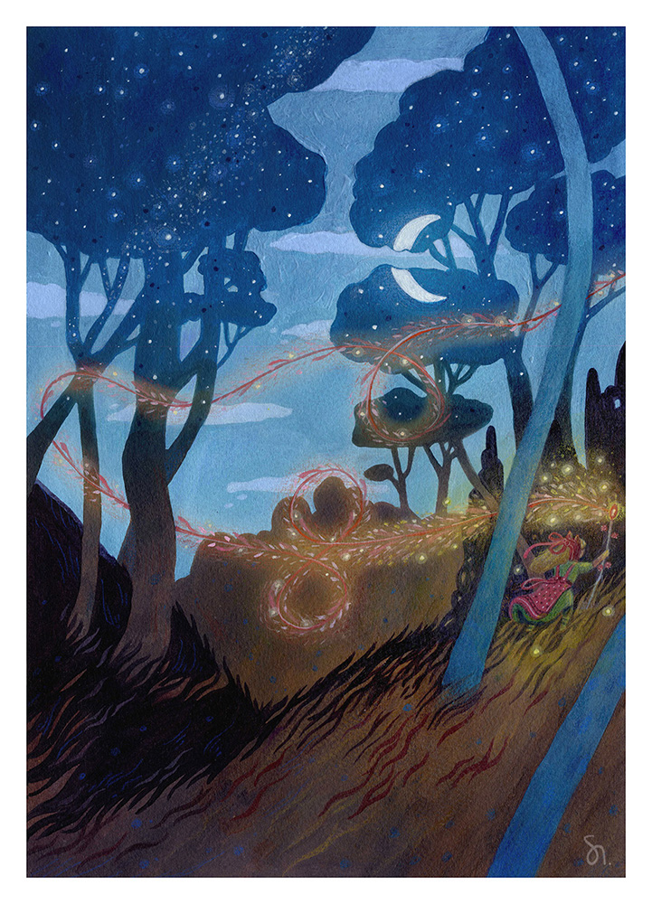 A magical night in an enchanted forest where a little witch spreads her magic.